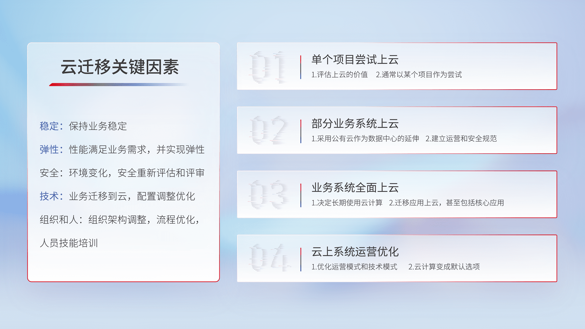 结合实际业务,,从规划设计、、、云平台选型、、云原生改造、、、、数据迁移、、集成交付,,,迁移全过程为客户识别最佳上云路径,,做好风险识别管理,,,设计网络架构、、、身份权限、、、安全审计合规、、、操作审计、、日志审计、、监控告警策略、、多站点容灾设计等,,,,对云上基础设施进行整体规划,,,提升IT治理水平,,,以满足弹性、、、、高可用、、、、高性能的需求。。。。