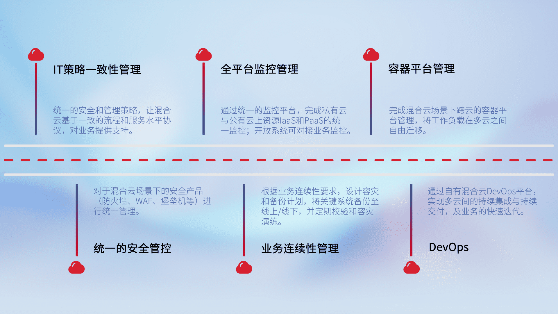 通过多云纳管,,,以统一的资源数据模型把客户的云资源进行抽象和封装,,,进而实现对多云资源的统一操作,,,,保障云资源管理的可靠性、、稳定性与可用性。。。。量身定制化运维内容,,,配置、、、开发运维、、、、补丁管理、、备份、、、、监控、、、认证和访问管理、、、、审计和日常巡检等,,,保障在用云过程中的可靠度,,,,稳定度以及高可用率。。。