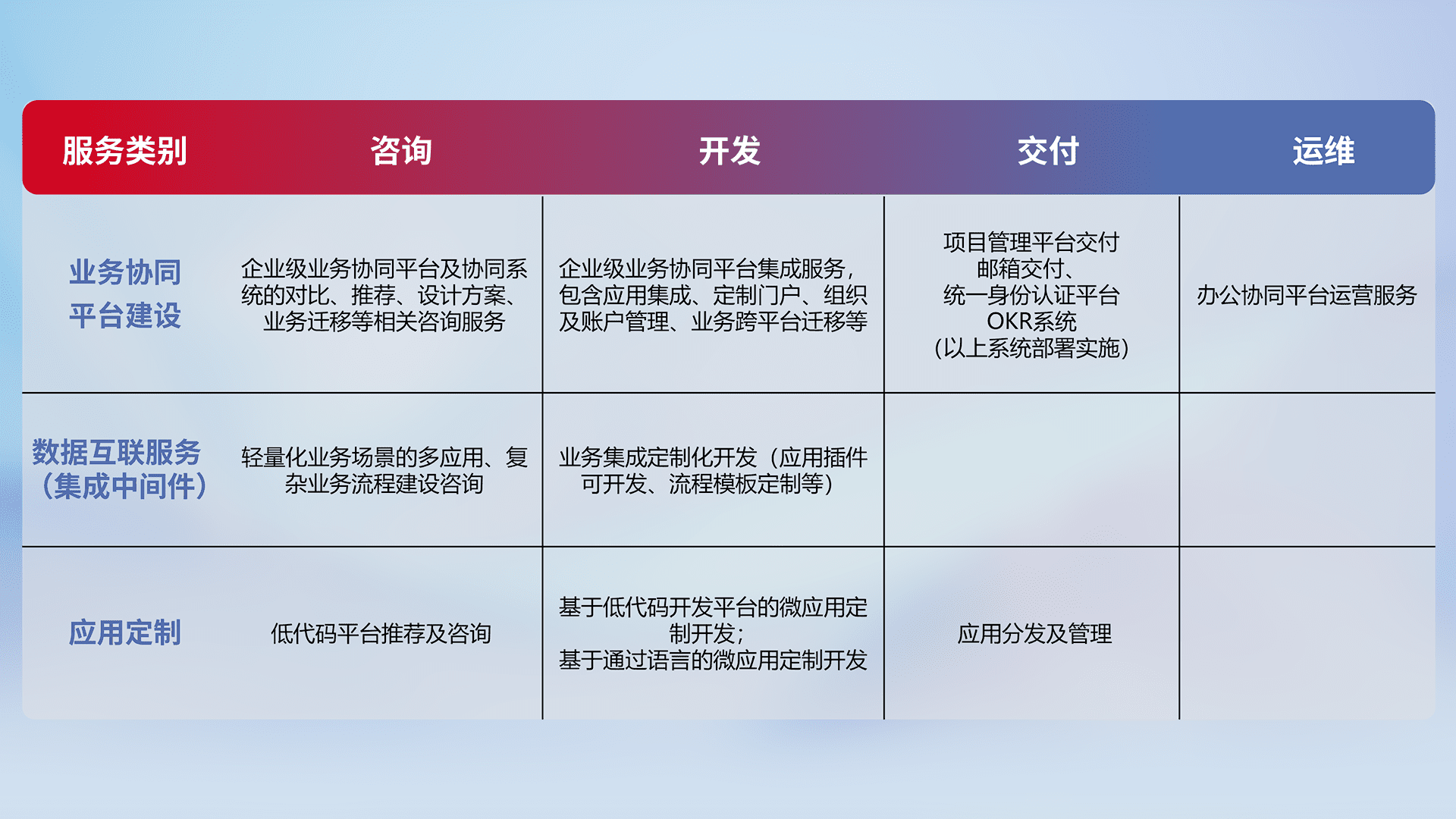 针对钉钉、、企微、、IDaas等平台级产品提供产品的规划、、、方案、、、交付、、定制化开发等服务,,实现如统一协同办公、、智能客户服务、、、混合会议管理、、、、智能数据查询、、、、等业务场景,,,实现数字化转型。。。。